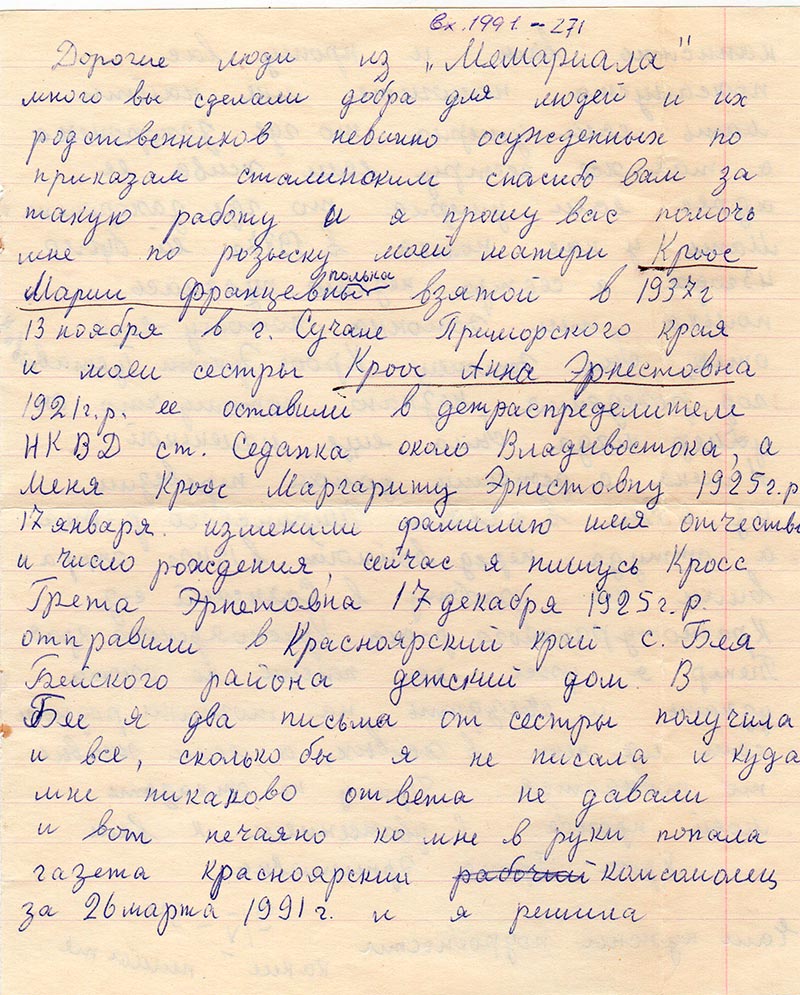 рождения, сейчас я пишусь Кросс Грета Эрнетовна 17 декабря 1925 г. р. отправили
