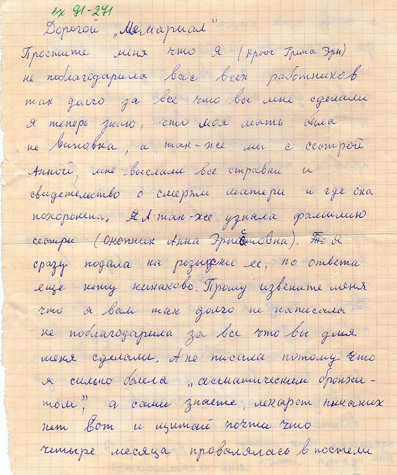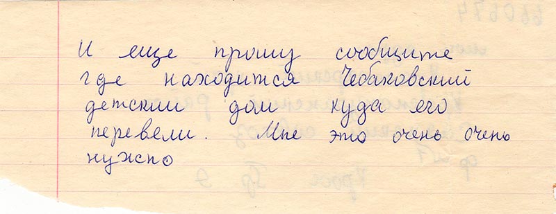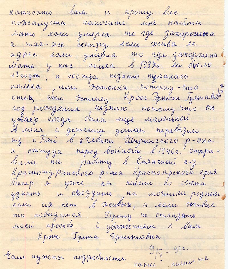 В Бее я два письма от сестры получила и все, сколько бы я не писала и куда мне никаково ответа не давали и вот нечаяно ко мне в руки попала газета Красноярский комсомолец за 26 марта 1991 г. и я решила написать вам и прошу вас пожалуйста помогите мне найти мать если умерла то где захоронена и так-же сестру если жива ее адрес если умерла то где захоронена.