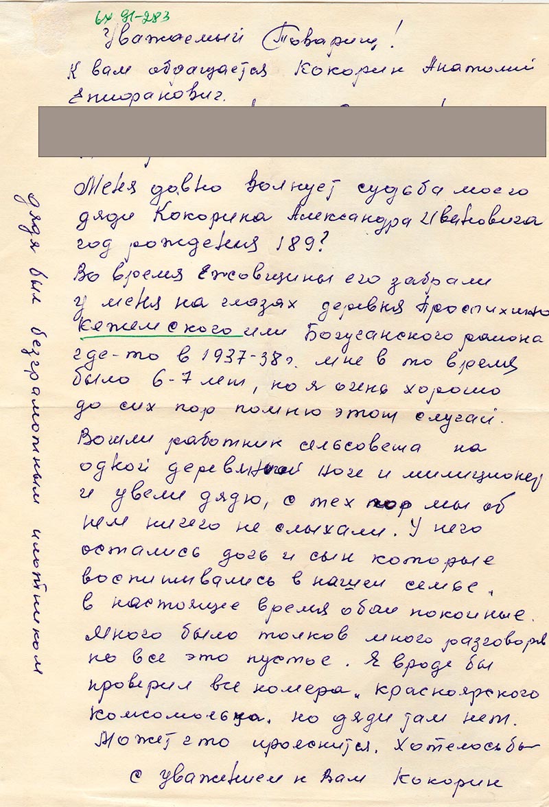 Во время Ежовщины его забрали у меня на глазах деревня Проспихино Кежемского или Богучанского района где-то в 197-38 г. мне в то время было 6-7 лет, но я очень хорошо до сих пор помню этот случай. Вошли работник сельсовета на одной деревянной ноге и милиционер и увели дядю, с тех пор мы об нем ничего не слыхали. У него остались дочь и сын которые воспитывались в нашей семье, в настоящее время обои покоиные. Много было толков много разговорв но все это пустое. Я вроде бы проверил все номера «красноярского комсомольца, но дяди там нет. Может это прояснится. Хотелось бы