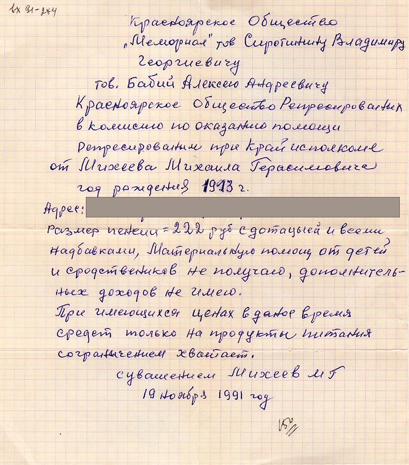 Красноярское Общество Репресированых в комисию по оказанию помощи