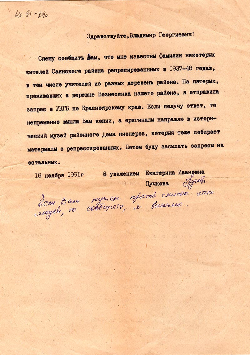 Спешу сообщить Вам, что мне известны фамилии некоторых жителей Саянского района рересированнных в 1937-48 годах, в том числе учителей из разных деревень района. На пятерых, проживающих в деревне Вознесенка нашего района, я отправила запрос в УКГБ по Красноярскому краю. Если получу ответ, то непременно вышлю Вам копии, а оригиналы направлю в исторический музей районного Дома пионеров, который тоже собирает материалы о репрессированных. Потом буду засылать запросы на остальных.
