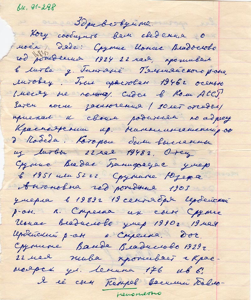 Хочу сообщить вам сведения о моём дяде: Срумис Ионас Владослово год рождения 22 мая 1924, проживал в Литве в д. Гинтянё Тяльшяйского р-она, литовец. Был арестован 1946 г осенью (месяц не помню). Сидел в Коми АССР. Затем после заключения (10 лет отсидел) приехал к своим родителям по адресу Красноярский край Нижнеингашский р-он д Победа. Которые были высланны из Литвы 22 мая 1948 г. Отец Срумис Владас Банифацас умер в 1951 или 52 гг. Срумите (???) Юзека Антоновна год рождения 1903 умерла в 1989 г. 19 сентября Ирбейский р-он. п. Стрелка