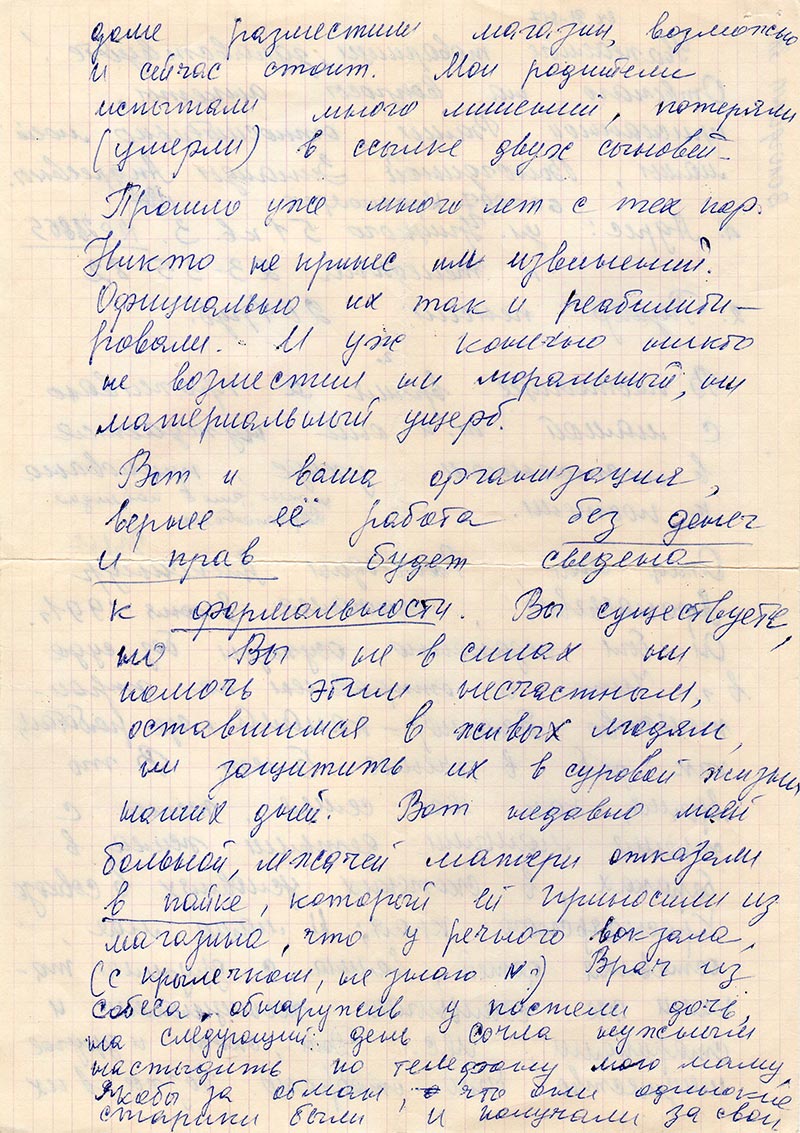 Вот и ваша организация, вернее её работа без денег и прав будет сведена к формальности. Вы существуете, но Вы не в силах ни помочь этим несчастным оставшимся в живых людях, ни защитить их в суровой жизни наших дней. Вот недавно моей больной, лежачей матери отказали в пайке, который у речного вокзала, (с крылечком, не знаю №?) Врач из собеса, обнаружив у постели дочь, на следующий день сочла нужным настыдить по телефону мою маму, якобы за обман, что они одинокие старики были и получали за свои деньги паёк. Но они никого не обманывали, и ничего в Собесе не просили, это сделали за них другие, добрые чужие люди. И мной они, конечно не были брошены, но жили мы в разных квартирах, пока это было возможно, сейчас я постоянно с мамой. Но дело ведь не только в том есть ли кому принести продукты, а сейчас, ещё вопрос стоит где взять? что можно старому больному человеку купить в магазине? До недавнего времени не было растит. масла напр. совсем. Нет так же и сейчас «Геркулеса» и др. круп, необход. старому человеку и пр.