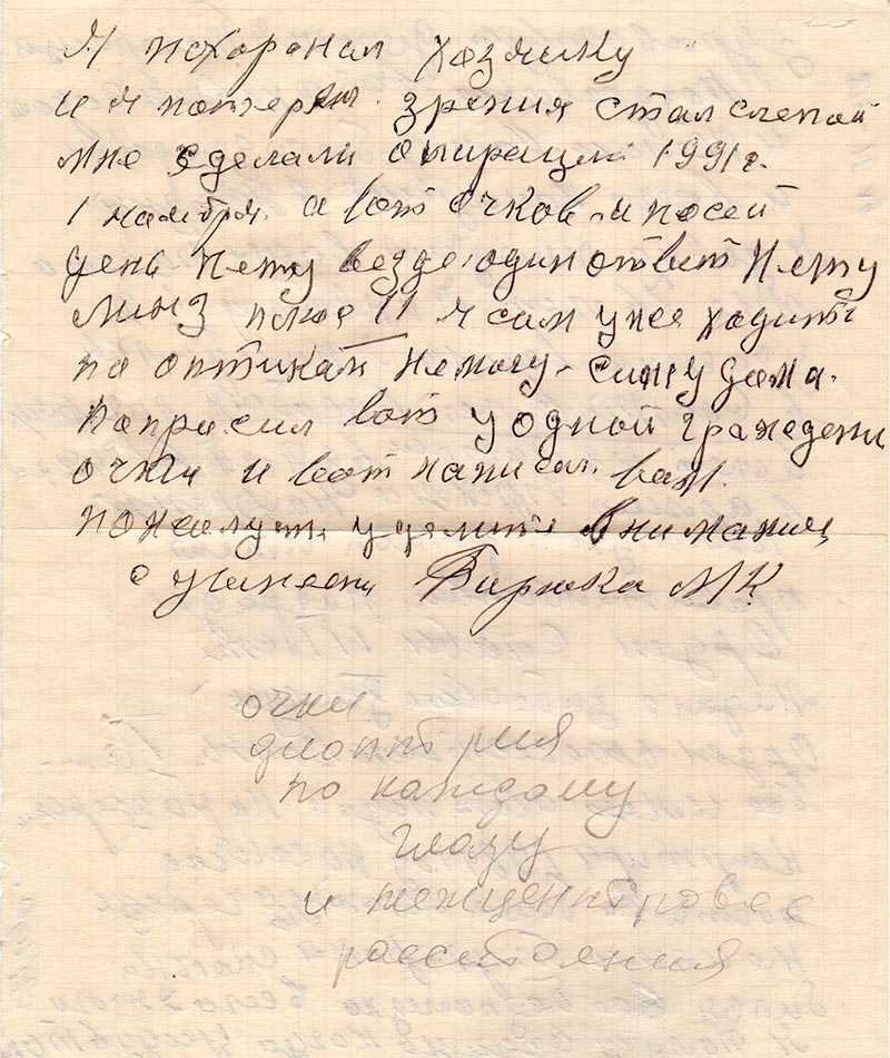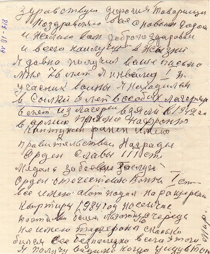 Я давно получил ваше письмо. Мне 76 лет. Я инвалид I г. участник воины. Я находился в сылки 6 лет в особых лагерях 6 лет. Из лагерей взяли в 1942 г. в армию прямо на фронт. Кантужен ранен имею правительственные награды Орден Славы III ст. Медаль за боевые заслуги. Орден отечественой Войны I ст. все имею. а вот подал на расширение квартиры 1984 год по сейчас поставили более последнюю очередь. Не имею телефона сколько бился безполезно всего это я получу видимо когда уйду в тот мир.