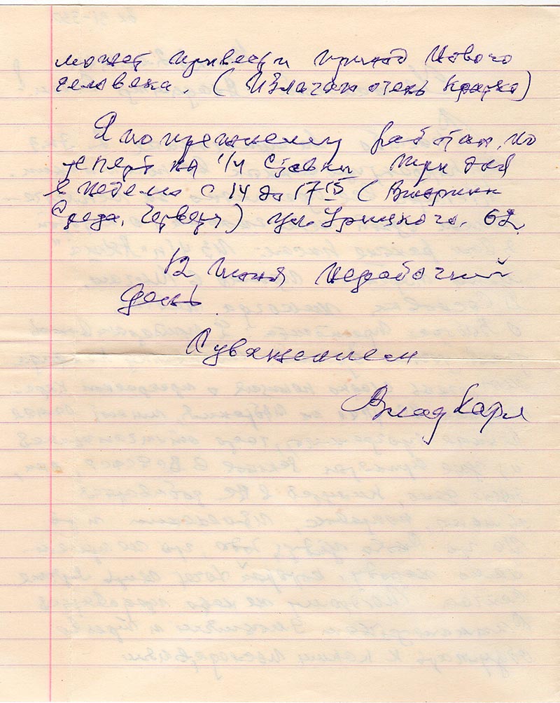 После окончания курсов радиотехников Осоавиахима (сейчас Досааф) в Саратове в 1933 г. был направлен на работу в Свердловск. В 1934 г. Уехал по приглашению в г. Комсомольск н/Амуре и Хабаровск. Позднее работал в Арктике на полярной станции в бухте (заливе) Кожевникова, а не на мысе Косистом. Нордвикская экспедиция работала также в Кожевникова, а не на Косистом. Во внутренней тюрьме репродуктор (колокол) висел не в камере а на улице за окном. На стр. 2 гриф «Сов. Секретно» (аппарат-волнометр) был погашен но штамп по невнимательности был поставлен ниже слов «сов.секр.» В декабре 42 г. объявили приговор особого Совещания НКВД СССР (пропущено) ст. АСА – 10 лет ИТЛ. Вы пишите «в тюремной церкви» надо бывшей. Это транзитная камера. После уточнения будет правильно: (ст. 2 внизу) «на сутки в КПЗ от п/я 235» и ниже «Акша п/я 235».