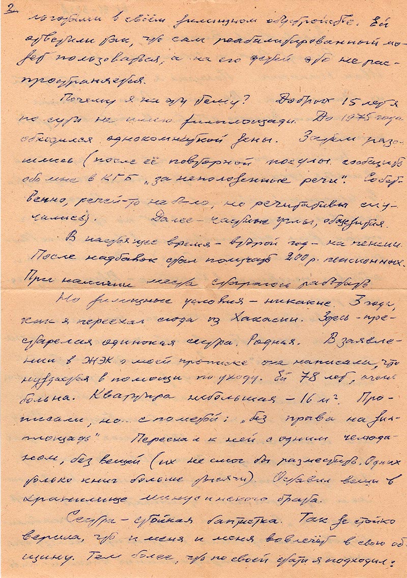 Но жилищные условия – никакие. 3 года, как я переехал сюда их Хакасии. Здесь – престарелая одинокая сестра. Родная. в заявлении в ЖЭК о моей прописке она написала, что нуждается в помощи по уходу. Ей 78 лет, очень больна. Квартира небольшая – 16 м2. прописали, но с пометкойй: «без права на жилплощадь». Переехал к ней с одним чемоданом, без вещей (их не смог бы разместить. Одних только книг больше тысячи). Оставил вещи в хранилище минусинского брата.