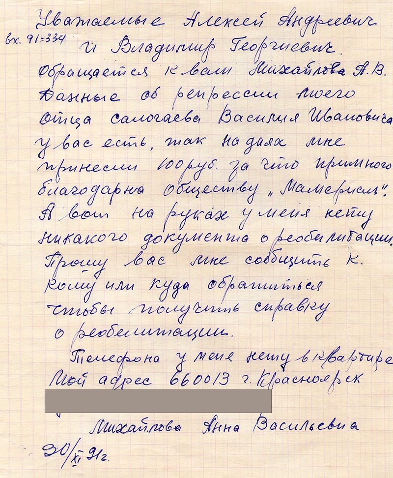 Данные об репрессии моего отца Салогаева Василия Ивановича у вас есть, так на днях мне принесли 100 руб. за что примного благодарна обществу «Мемориал». А вот на руках у меня нету никакого документа о реабилитации.