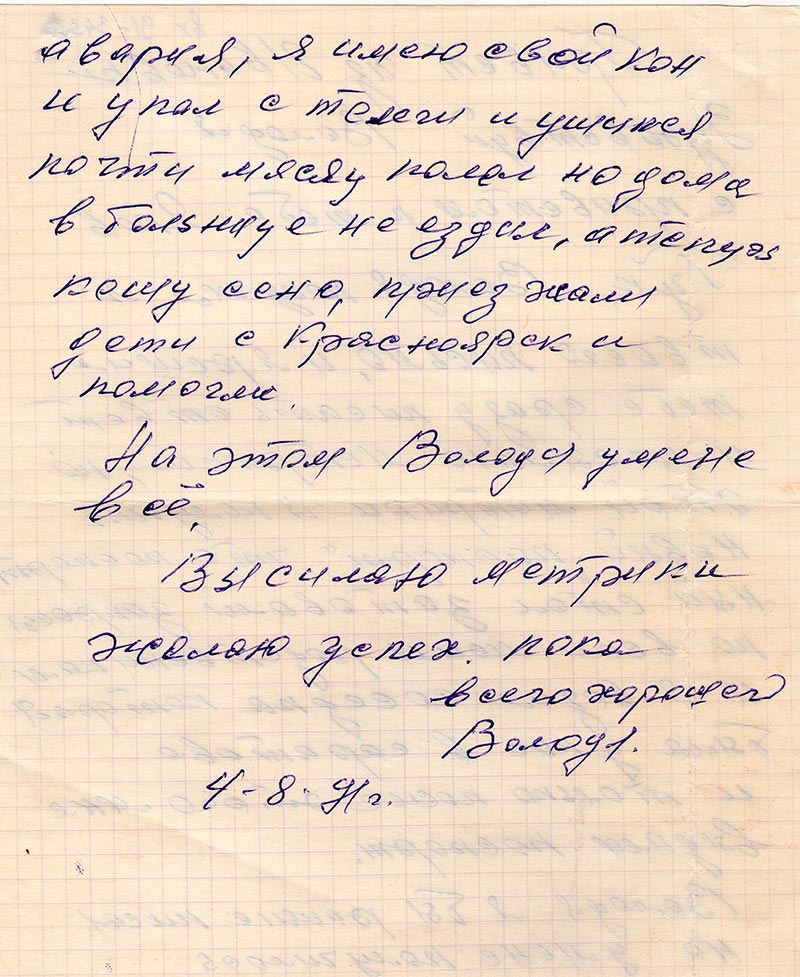 Володя я бы ранше писал но у мене получилось авария, я имею свой кон и упал с телеги и ушипся почти месяц полел но дома в больнице не ездил, а теперь кошу сено, приезжали дети с Красноярск и помогли.