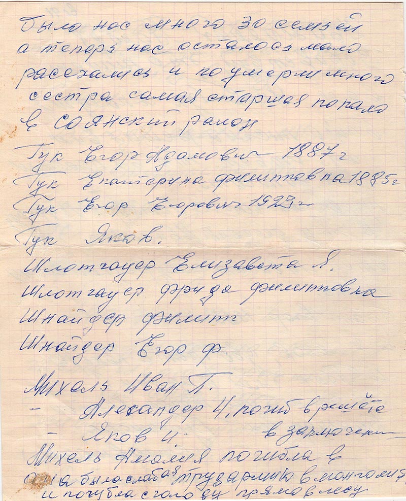 Володя этот список что прислал я последняя графа сразу не заметил и напартачил тебе там немного, Володя я тебе ещё послал список сколько вошли в память ток по лицу могу себе припоминать а фамилия уже не спомнуть, уже славо Got. 45 лет. прошло – есть еще наш пекарь Майер Александр 1918 и еще Оля Кнауп 1928 не знаю откуда ана. Володя конечно эти три года не в стаж я пач. 114 руб. пенс