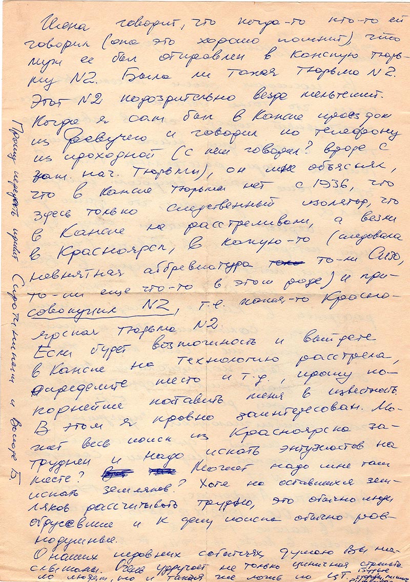 Если будет возможность и выйдете в Канске на технологию расстрела, определите место и т. д., прошу покорнейше поставить меня в известность. В этом я кровно заинтересован. Может весь поиск из Красноярска затруднен и надо искать энтузиастов на месте? ??? ??? Может надо мне там искать земляков? Хотя на оставшихся земляков рассчитывать трудно, это обычно люди, обрусевшие и к делу поиска обычно ровнодушные.