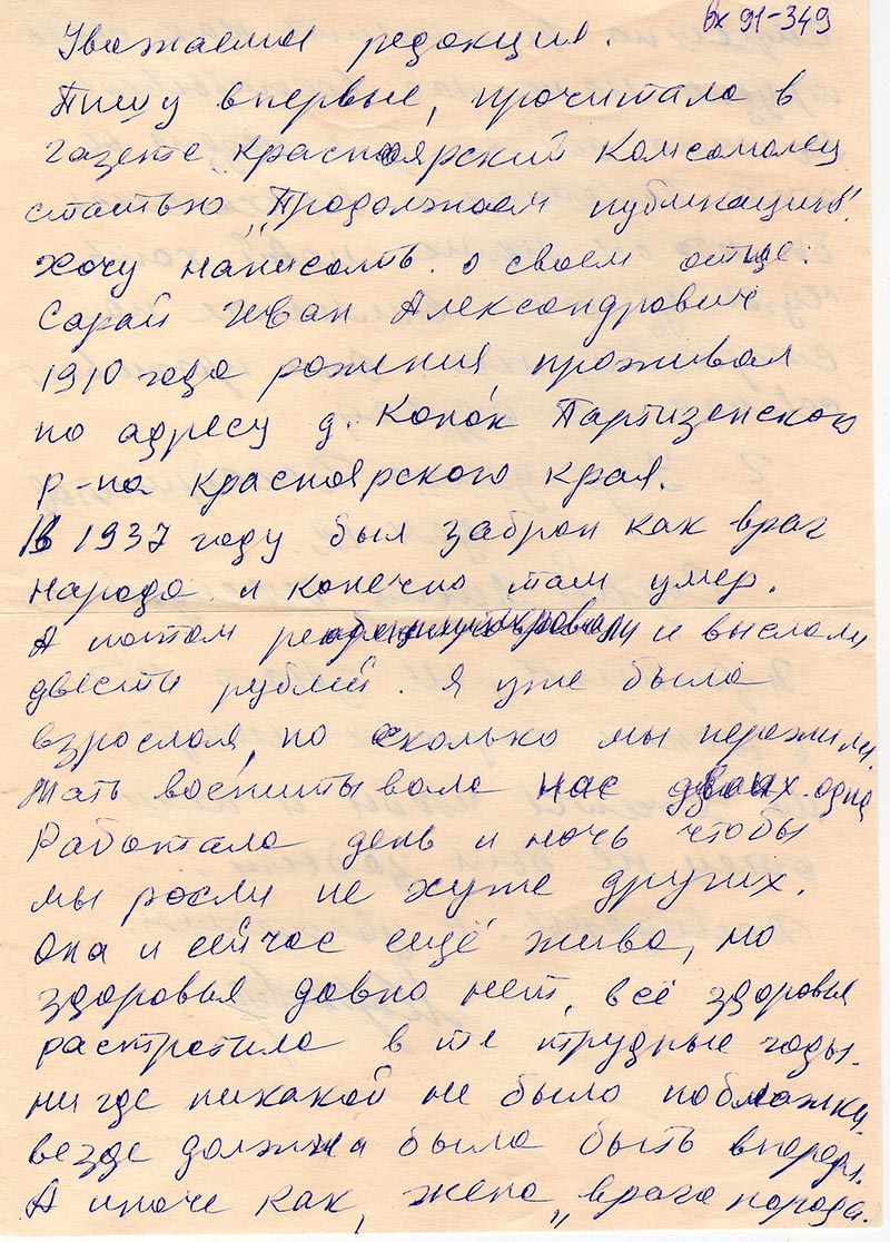 Пишу впервые, прочитала в газете Красноярский Комсомолец статью «Продолжаем публикацию». Хочу написать о своей отце. Сарай Иван Александрович 1910 года рождения, проживал по адресу д. Конок Партизанского р-на Красноярского края.