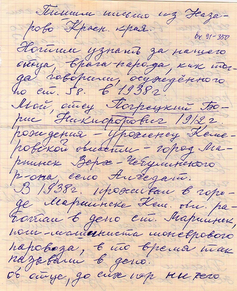 Хотим узнать за нашего отца, врага-народа, как тогда говорили, осуждённого по ст. 58. в 1938 г.