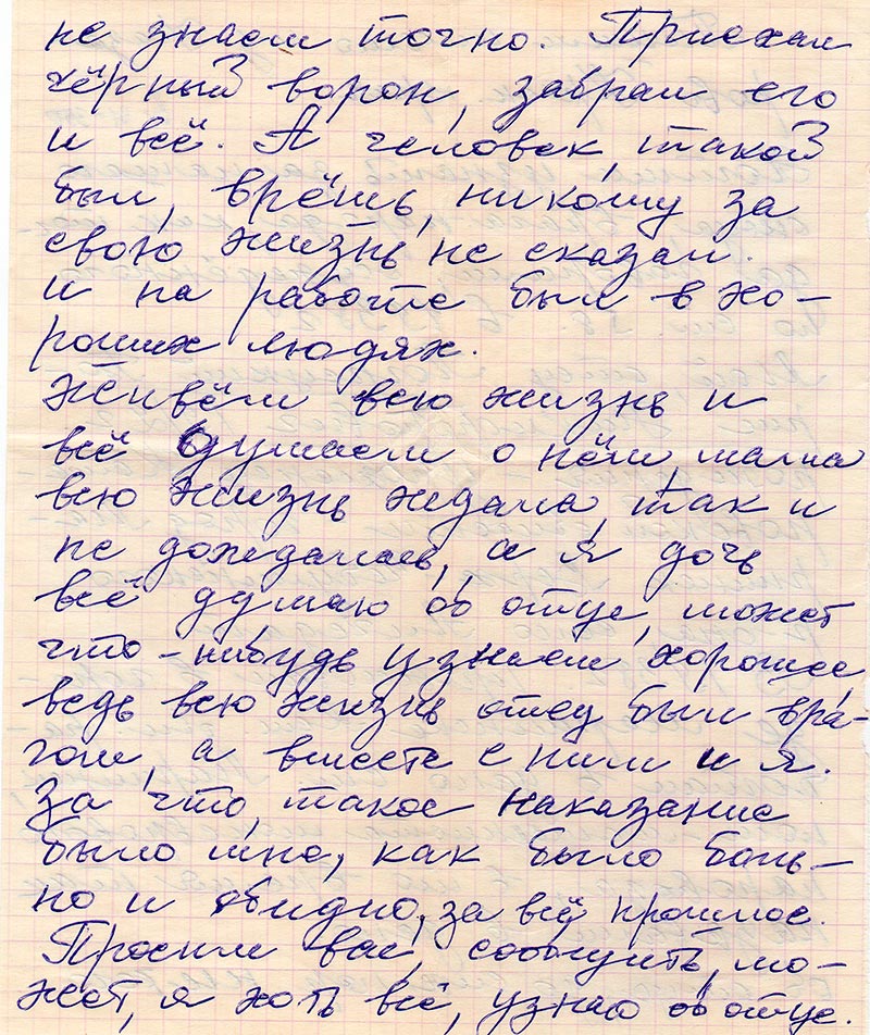 об отце, до сих пор ничего не знаем точно. Приехал чёрный ворон, забрал его и всё. А человек, такой был, врёшь, никому за свою жизнь не сказал и на работе был хороших людях.