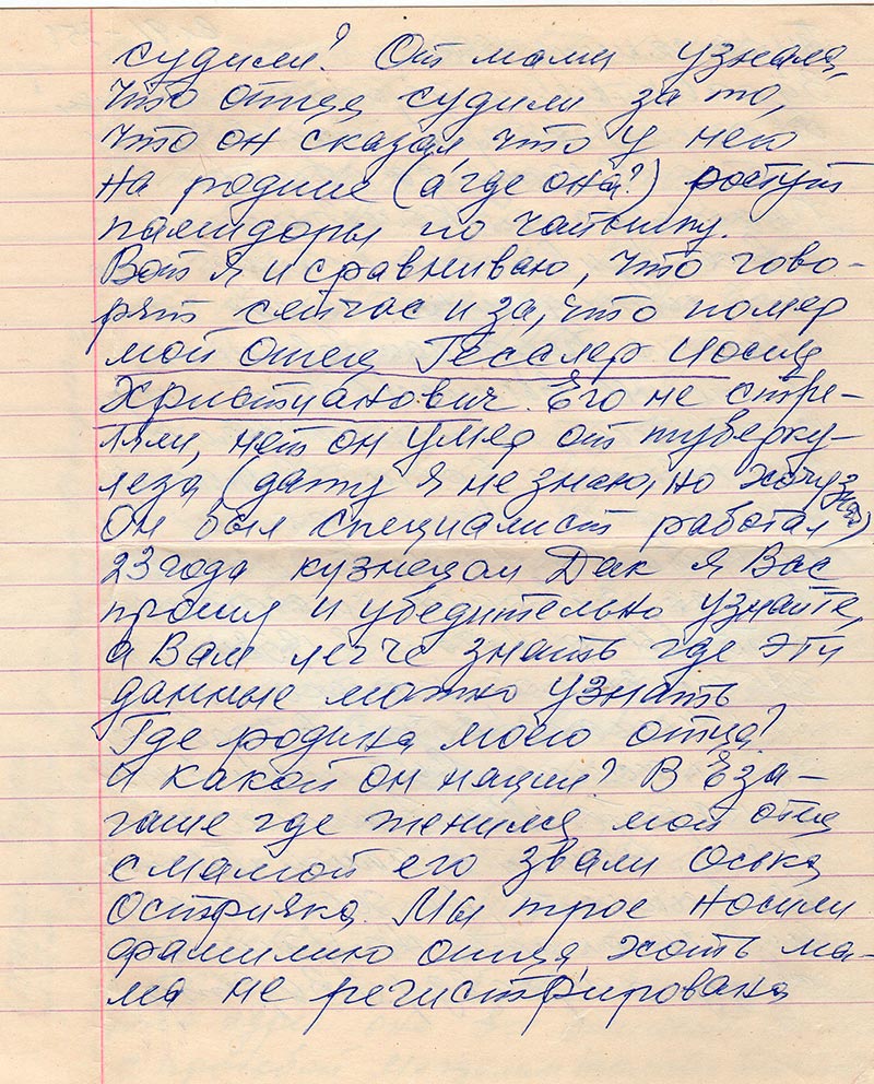 Я пишу второй раз в Ваш адрес. Слежу за газетой «Красноярский Комсомолец» и все удивляюсь почему именно в молодежной газете пишете о репрессированных, ее же не выписывают люди пожилые, которые помнят то тяжкое время. Я именно пишу и прошу ответить на мое письмо. Когда забрали моего отца, это было ночью в 1938 году где-то зимой, только помню, я училась в 5 кл. в Деребино где и жили. Суд был в 1939 в марте. Вспоминаю шли через Енисей с мамой. Тяжело вспоминать, но хочу еще и еще плакать, но узнать сущую правду. За, что судили? От мамы узнала, что отца судили за то, что он сказал, что у него на родине (а где она?) растут памидоры по чайнику. Вот я и сравниваю, что говорят сейчас и за, что помер мой отец Гесслер Иосиф Христианович. Его не стреляли, нет он умер от туберкулеза (дату я не знаю, но хочу знать). Он был специалист работал 23 года кузнецом. Дак я Вас прошу и убедительно узнайте, а Вам легче знать где эти данные можно узнать