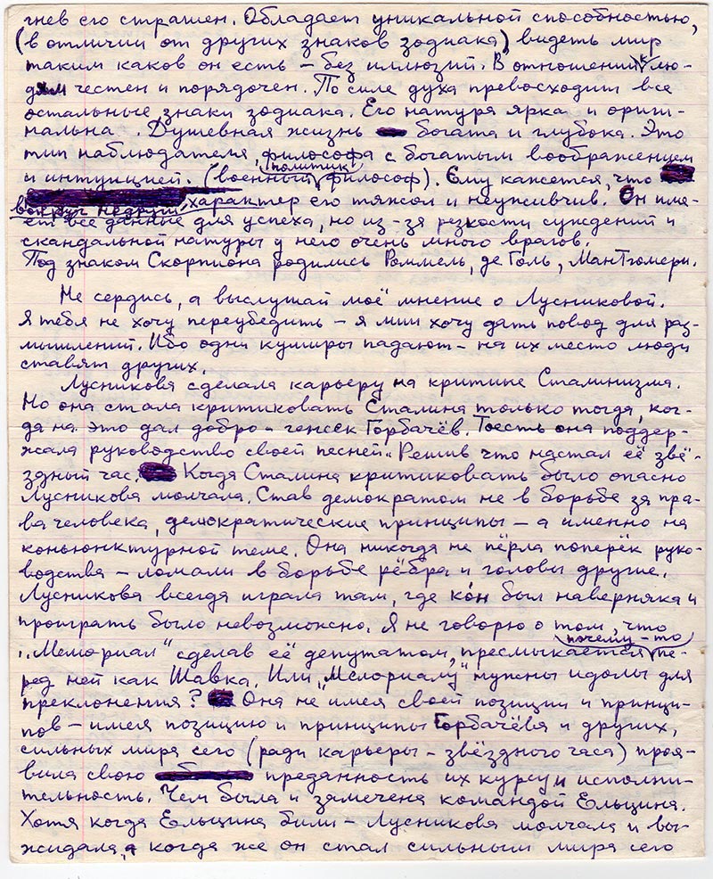 Лусникова сделала карьеру на критике Сталинизма. Но она стала критиковать Сталина только тогда, когда на это дал добро – генсек Горбачёв. Тоесть она поддержала руководство своей песней. Решив что настал её звёздный час. Когда Сталина критиковать было опасно Лусникова молчала. Став демократом не в борьбе за права человека, демократические принципы – а именно на коньюнктурной теме. Она никогда не пёрла поперёк руководства – ломали в борьбе рёбра и головы другие. Лусникова всегда играла там, где кон был наверняка и проиграть было невозможно. Я не говорю о том, что «Мемориал» сделав её депутатом, пресмыкается почему-то перед ней как шавка. Или «Мемориалу» нужны идолы для преклонения? Она не имея своей позиции и принципов – имея позицию и принципы Горбачёва и других, сильных мира сего (ради карьеры – звёздного часа) проявила свою ???? преданность их курсу и исполнительность. Чем была и замечена командой Ельцина. Хотя когда Ельцина били – Лусникова молчала и выжидала, а когда же он стал сильным мира сего она завертелась перед ним в реверансах. И когда ей предложили этим летом стать доверенным лицом Ельцина, в предвыборной компании – её карта была поставлена на Ельцина бесповоротно. Ибо всё (вся карьера) теперь зависела от него.