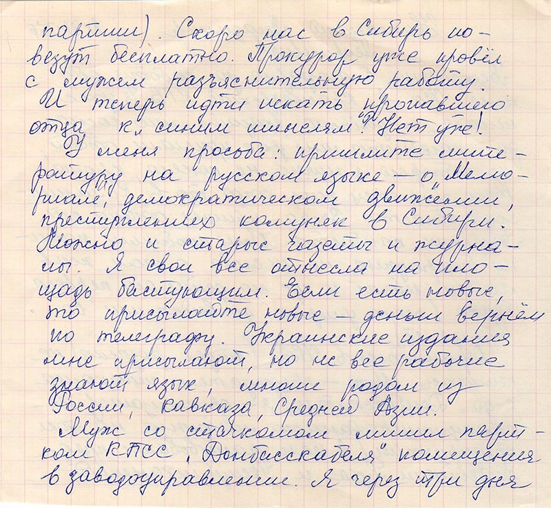 Обратиться в УВД (отдел розыска) не решаюсь. Муж - председатель стачкома з-да «Донбасскабель», я - организатор неманкционированного митинга на этом предприятии (в нем участвовали представители Руха и Республиканской партии). Скоро нас в Сибирь повезут бесплатно. Прокурор уже провел с мужем разъяснительную работу.