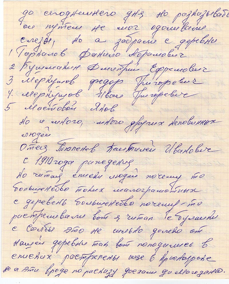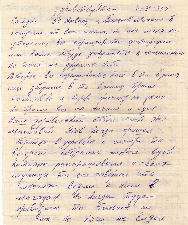 Второе вы спрашиваете кого в то время еще забирали, в то время брали поголовно я верно причин не знаю но брали все по ночам и один наш деревенский отбыл 10 лет это Мастовой Яков. Когда пришел обратно в деревню к сестре то вечером собралось много вдов которые распрашивали о своих мужях то он говорил что многих везли с ним в Магадан. Но когда туда привезли то больше он их не кого не видел до сегодняшнего дня. Но разказывать он путем не мог одоливали слезы, но а забрали с деревни