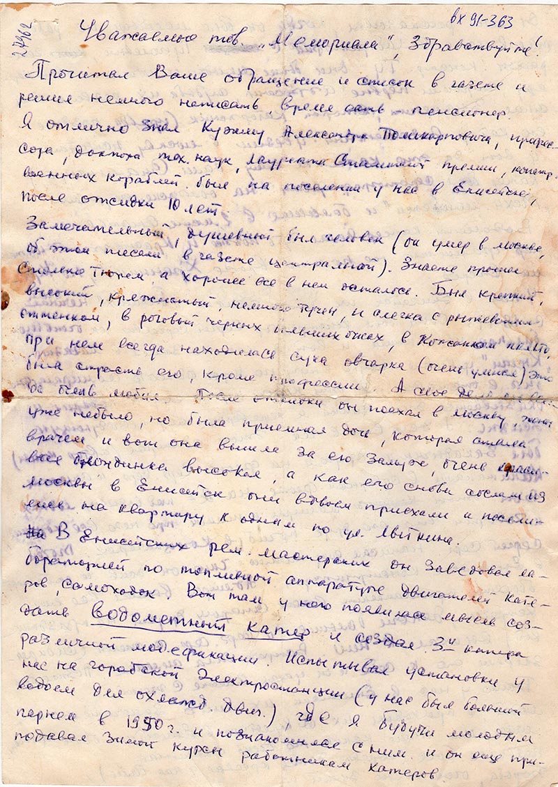 Прочитал Ваше обращение и список в газете и решил немного написать, время есть – пенсионер. Я отлично знал Кужму Александра Поликарповича, профессора, доктора тех. наук, лауреата Сталинской премии, констр. военных кораблей. был на поселении у нас в Енисейске, после отсидки 10 лет.