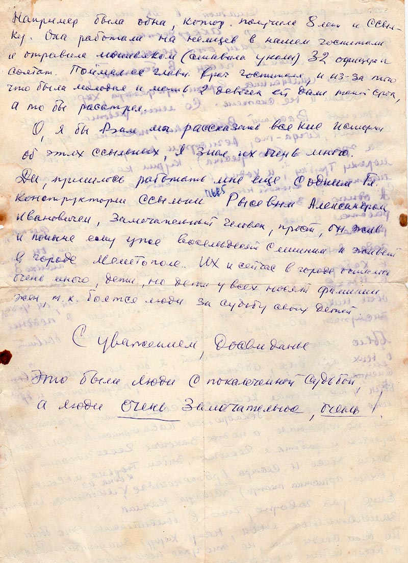 О, я бы Вам мог рассказать всякие истории об этих ссыльных, я знал их очень иного. Да, пришлось работать мне еще с одним Гл. конструктором ссылки (прим. 11685) Рысевым Александром Ивановичем, замечательный человек, прост, он жив и поныне ему уже восемьдесят с лишним и живет в городе Мелитополе. Их и сейчас в городе осталось очень много, дети, но дети у всех носят фамилии жен, т.к. боятся за судьбу своих детей.