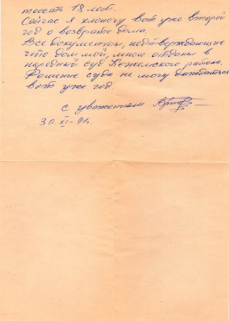 Сейчас я хлопочу вот уже второй год о возврате дома.