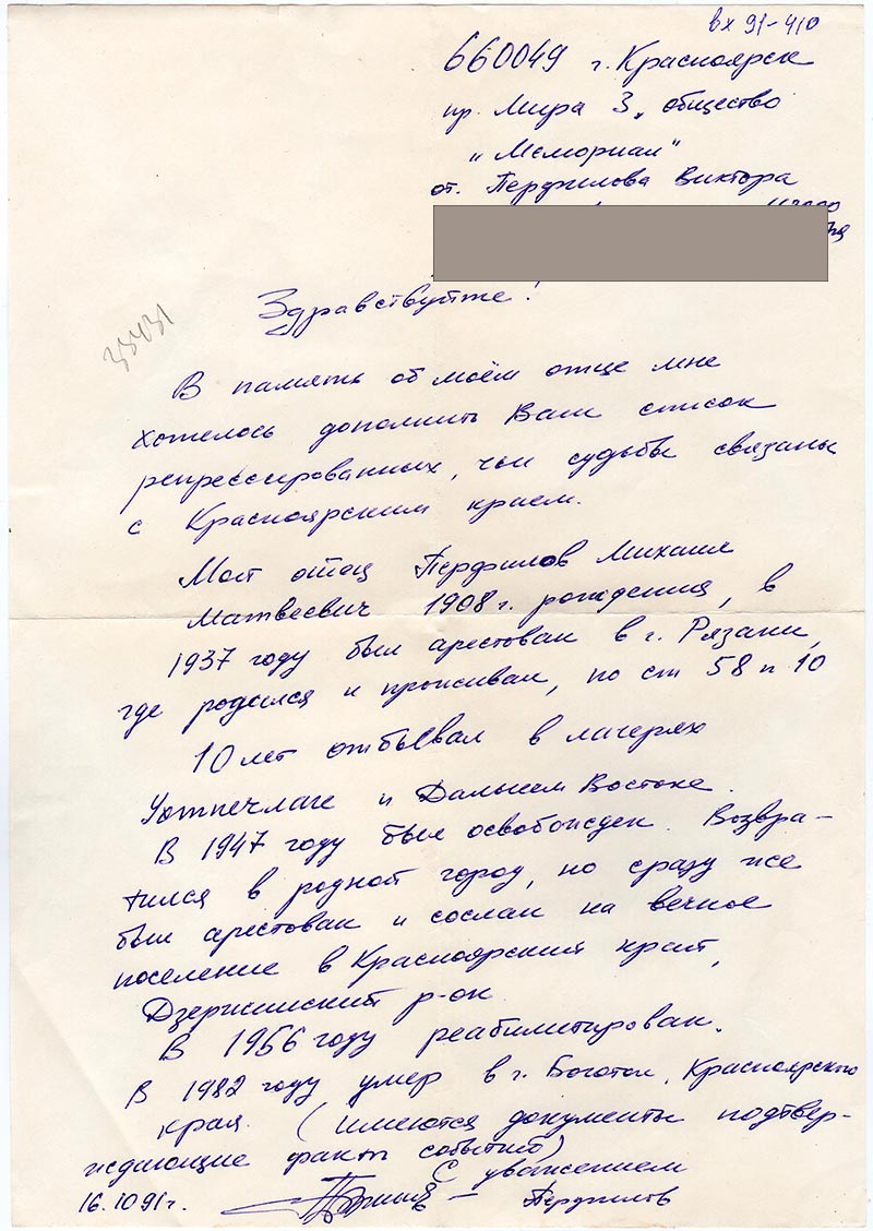 Мой отец Перфилов Михаил Матвеевич 1908 г. рождения, в 1937 году был арестован в г. Рязани, где родился и проживал, по ст. 58 п. 10.