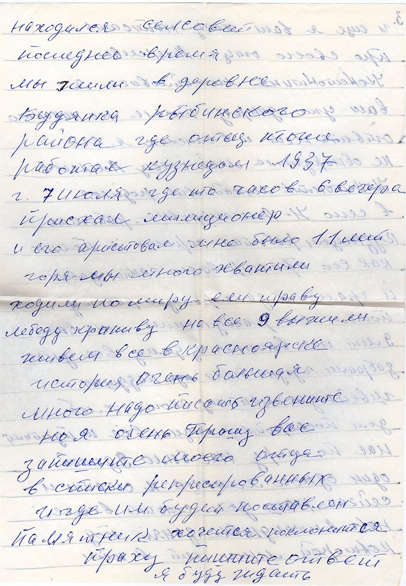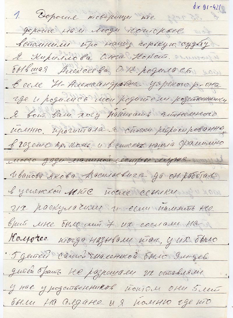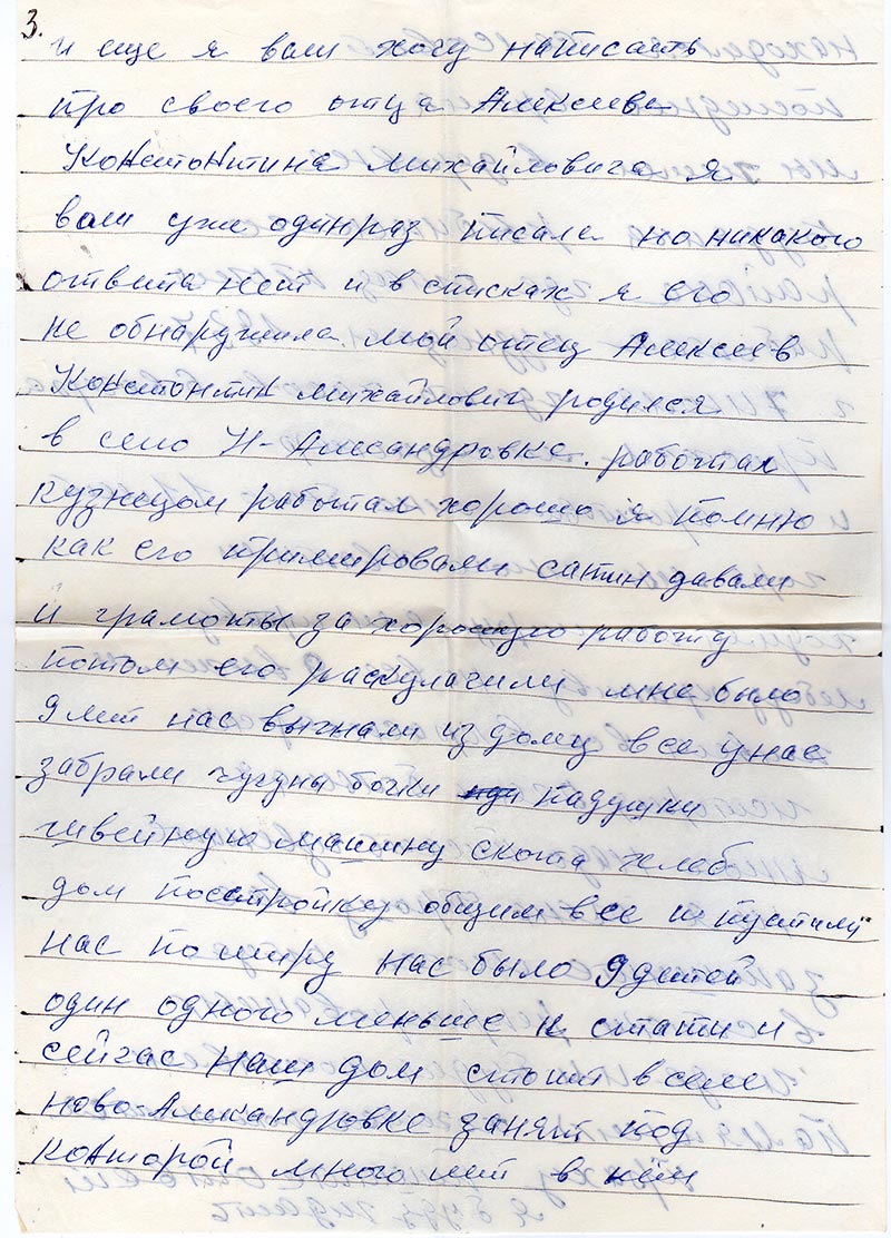 И еще я вам хочу написать про своего отца Алексеева Константина Михайловича я вам уже один раз писала но никакого ответа нет и в списках я его не обнаружила. Мой отец Алексеев Константин Михайлович родился в село Н-Александровка. Работал кузнецом работал хорошо я помню как его примировали сатин давали и грамоты за хорошую работу. Потом его раскулачили мне было 9 лет нас выгнали из дому все у нас забрали чугуны бочки иди подушки швейную машину скота хлеб дом постройку общим все и пустили нас по миру нас было 9 детей один одного меньше к стати и сейчас наш дом стоит в селе Н-Александровка занят под которой много лет в нем находился селсовет. Последнее время мы жили в деревне Будянка Рыбинского района где отец тоже работал кузнецом 1937 г. 7 июля где то часов 6 вечера приехал милиционер и его аристовал мне было 11 лет. Горя мы много хватили. Ходили по миру ели траву лебеду крапиву но все 9 выжили живем все в Красноярске.
