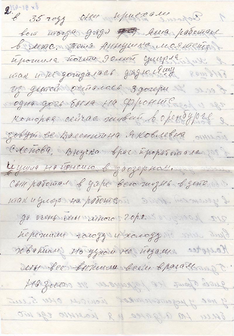 Их раскулачили и если память не врет мне было лет 7 их сослали на Колючи тогда называли так, у их было 5 детей самой маленькой было 9 м-цев детей брать не разрешали их оставляли у нас у родственников потом они 5 лет были на алдане и я помню где то в 35 году они приехали вот тогда дед дядя Яша работал в МТС. Тетя Аннушка моя тетя прожила почти 90 лет умерла так и не дождалась дядю Яшу