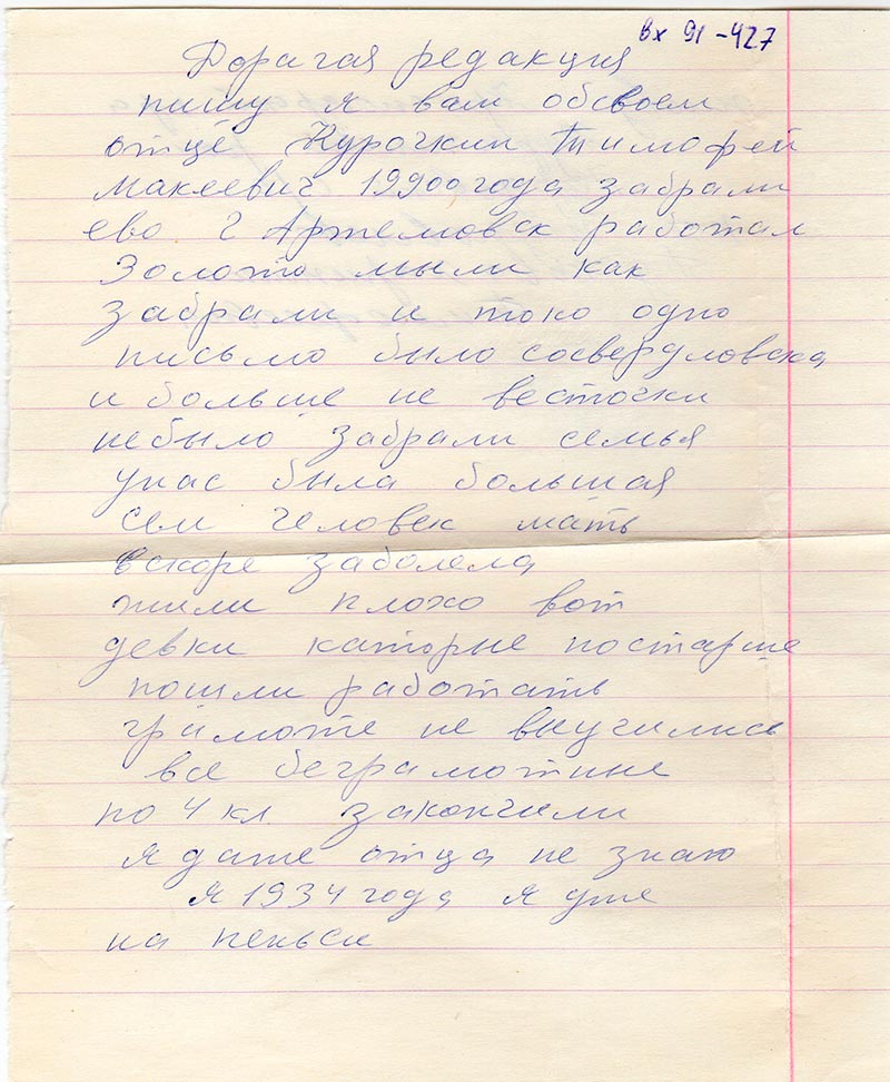 Пишу я вас об своем отце Курочкин Тимофей Макеевич 19900 года забрали его. г. Артемовск работал золото мыли как забрали токо одно письмо было со Свердловска и больше ни весточки не было забрали семья у нас была большая сем человек. Мать вскоре заболела. Жилил плохо вот девки которые постарше пошли работать грамоте не выучились все безграмотные по 4 кл закончили. Я даже отца не знаю. Я 1934 года я уже на пеньси.