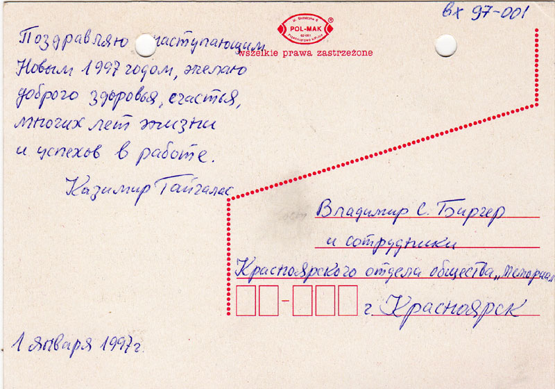 Поздравляю наступающим 1997 годом, желаю доброго здоровья, счастья, многих лет жизни и успехов в работе.