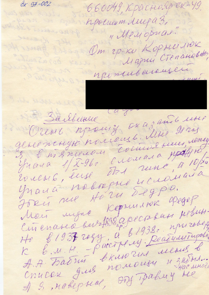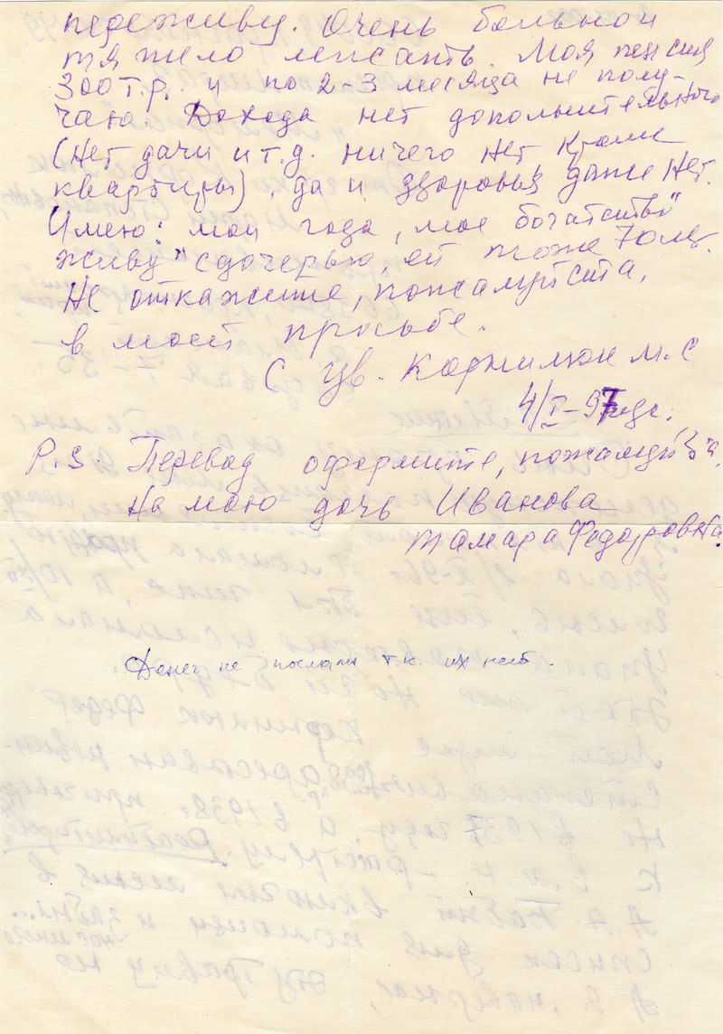 Очень прошу оказать мне денежную помощь. Мне 91 год я в тяжелом состоянии, лежу. Упала 1/X-96г. сломала правую голень, ещё был гипс, а 10/XII упала повторно и сломала этой же ноги бедро.