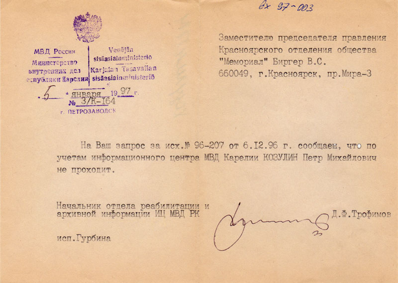 Письма в Красноярское общество "Мемориал"