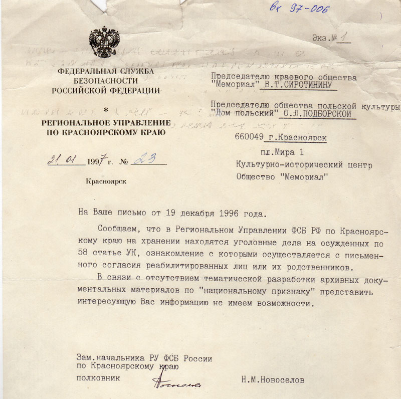Письма в Красноярское общество "Мемориал"