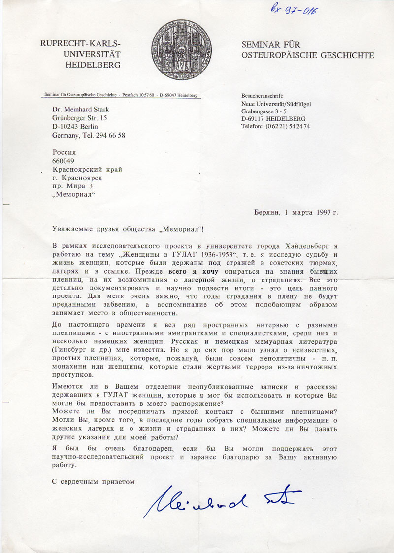 До настоящего времени я вел ряд пространных интервью с разными пленницами – с иностранными эмигрантками и специалистками, среди них и несколько немецких женщин. Русская и немецкая мемуарная литература (Гинсбург и др.) мне известна. Но я до сих пор мало узнал о неизвестных, простых пленницах, которые, пожалуй, были совсем неполитичны – н.п. монахини или женщины, которые стали жертвами террора из-за ничтожных проступков.