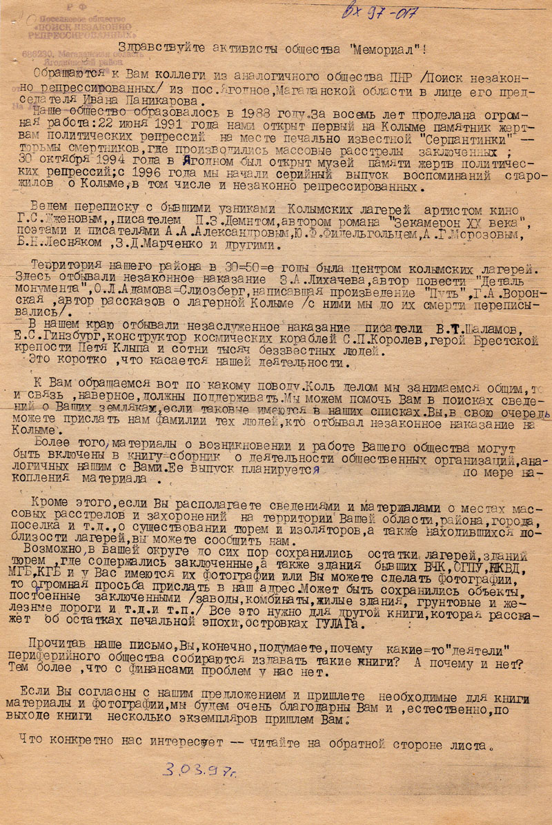 Обращаются к вам коллеги из аналогичного общества ПНР (Поиск незаконно репрессированных) из пос. Ягодное, Магаданской области в лице его председателя Ивана Паникарова.