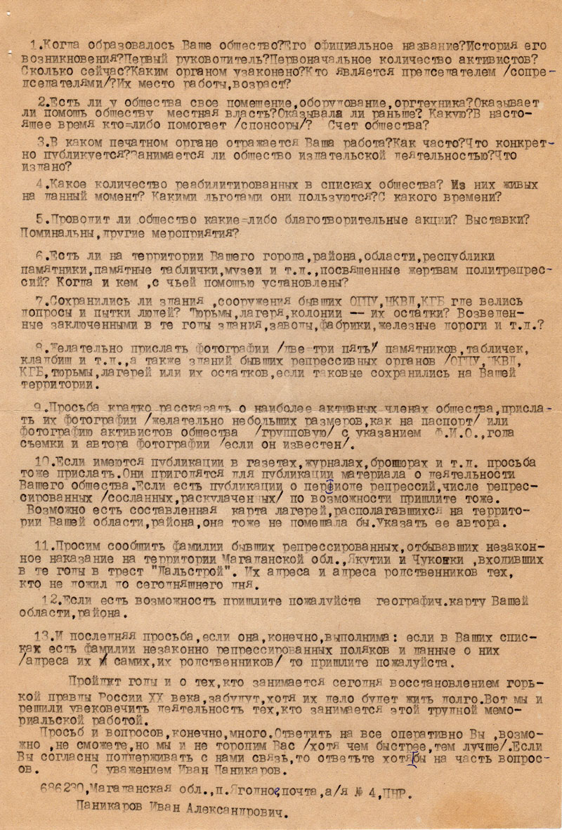 10. Если имеются публикации в газетах, журналах, брошюрах и т.д. просьба тоже прислать. Они пригодятся для публикации материала о деятельности Вашего общества. Если есть публикации о периоде репрессий, числе репрессированных (сосланных, раскулаченных) по возможности пришлите тоже. Возможно есть составленная карта лагерей, располагавшихся на территории Вашей области, района, она тоже не помешала бы. Указать её автора.