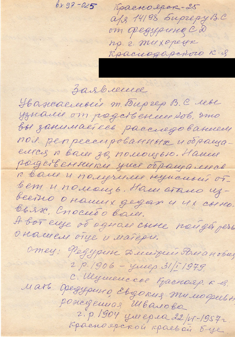 Уважаемый Биргер В.С мы узнали от родственников, что вы занимаетесь расследованием пол. репрессированных и обращаемся к вам за помощью. Наши родственники уже обращались к вам и получили нужный ответ и помощь. Нам стало известно о наших дедах и их сыновьях. Спасибо вам.