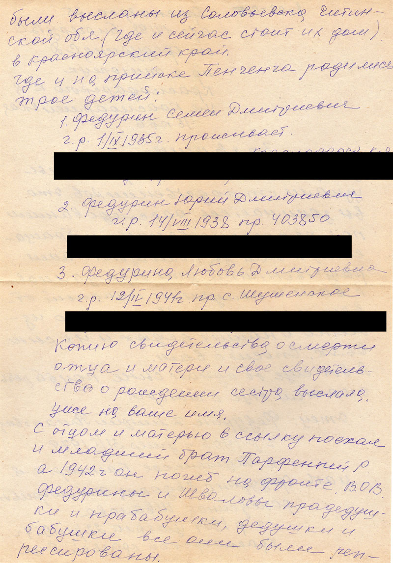 С отцом и матерью в ссылку поехал и младший брат Парфентий Р. а 1942 г он погиб на фронте. В.ОВ.