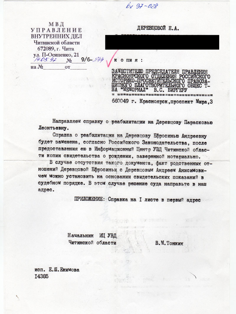 Письма в Красноярское общество "Мемориал"
