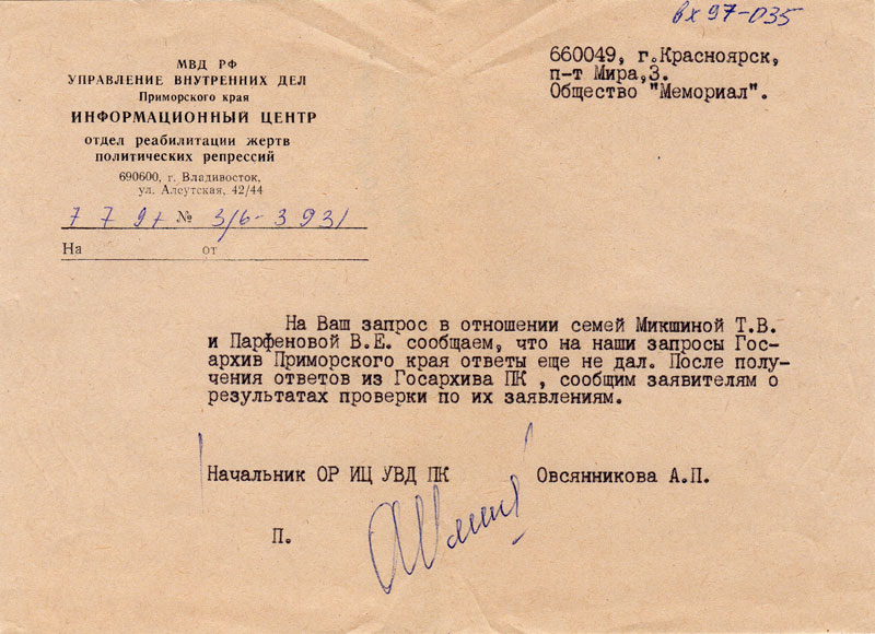Письма в Красноярское общество "Мемориал"