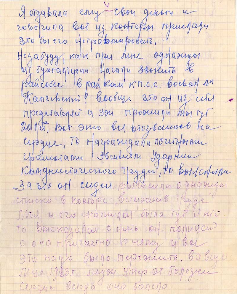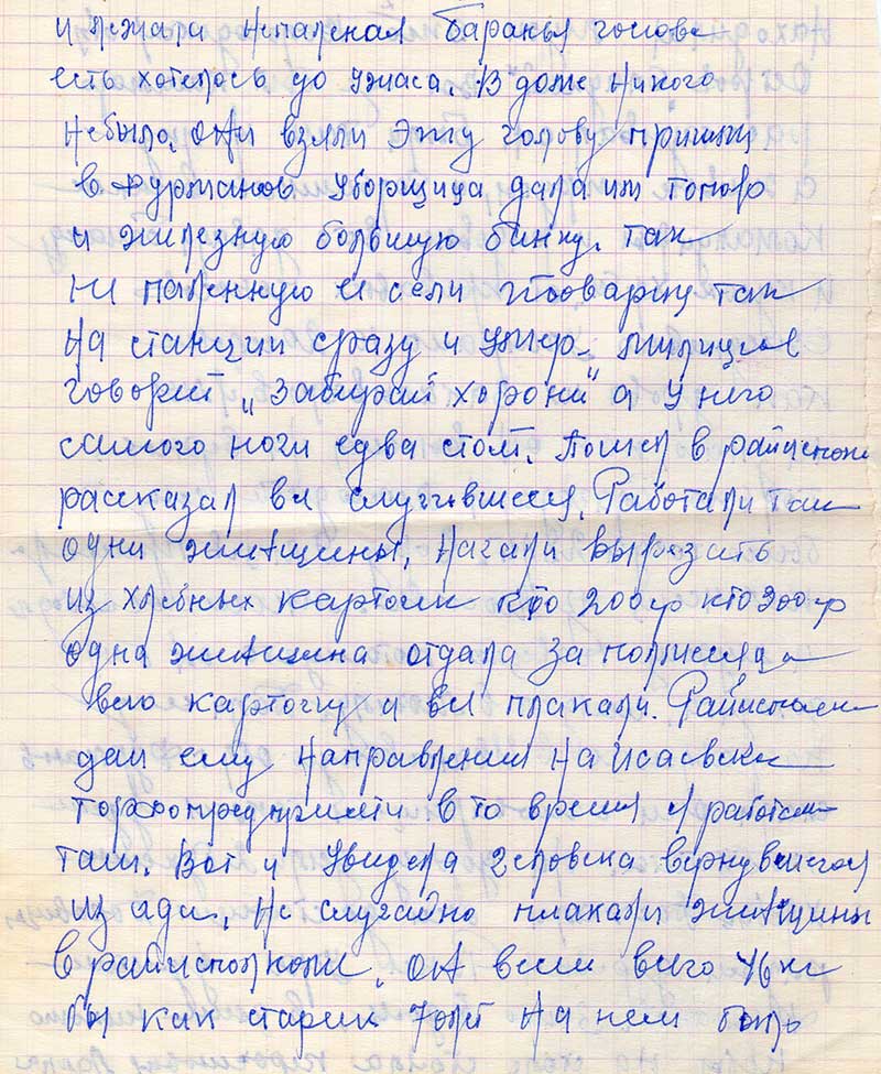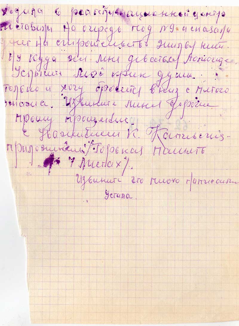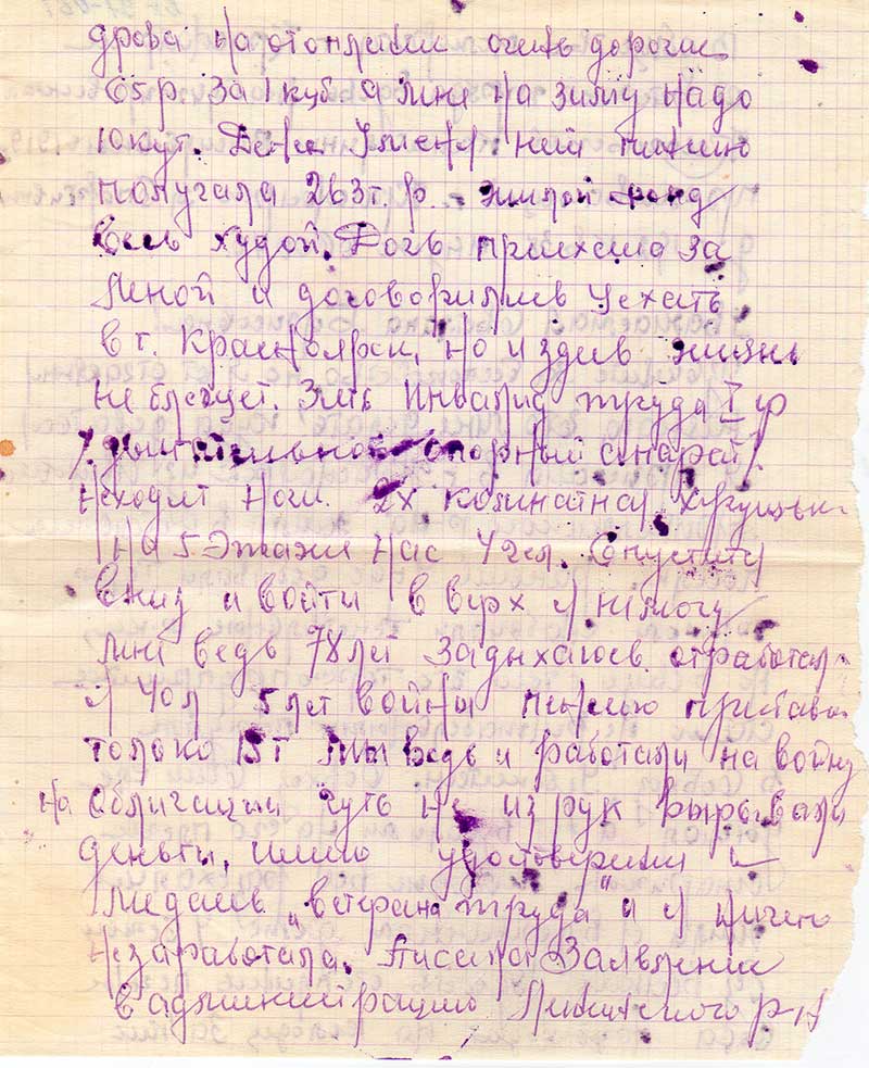 Извините за беспокойство, но я от отчаяння незнаю, что мне делать? Куда деваться. Я приехала в город Красноярск из Ивановс..(?) Приволжского р-на. Жила в небольшом посёлке. Раньше у нас добывали торф, торфом снабжали текстильные ф-ки, но в связи с тем что торфопредприятие стало не рентабельным - передали в совхоз «Узбекистан». Совхоз сам еле дышал а тут взвалили на его плечи стариков, молодые все разехались. Жила я в деревянном доме четыре семьи без всяких удобств, отопление печное вода надо ходит на колодец за 1 км дрова на отопление очень дорогие 65 р. за 1 куб. А мне на зиму надо 10 кубов. Денек у меня нет в пенсию получала 263 т. р. жилой фонд весь худой. Дочь приехала за мной и договорились уехать, в г. Красноярск, но и здесь жизнь не блещет. Зять инвалид труда I гр (двигательно - опорный аппарат) неходят ноги. 2х комнатная хрущевка на 5 этаже нас 4 чел. Спустится вниз и войти в верх я не могу. Мне ведь 78 лет задыхаюсь. Отработала я 40 л 5 лет войны пенсию прибавка только 13 (или 15? Растеклись чернила – не понятно) Мы ведь и работали на войну на облигации чуть не из рук вырывали деньги, имею удостоверение и медаль «ветерана труда» и я ничего не заработала. Писала Заявление в администрацию Ленинского р-н ходила в реабилитационный центр поставили на очередь под N 9 и сказали денег на строительство жилья нет. Ну куда же мне деваться Помогите.