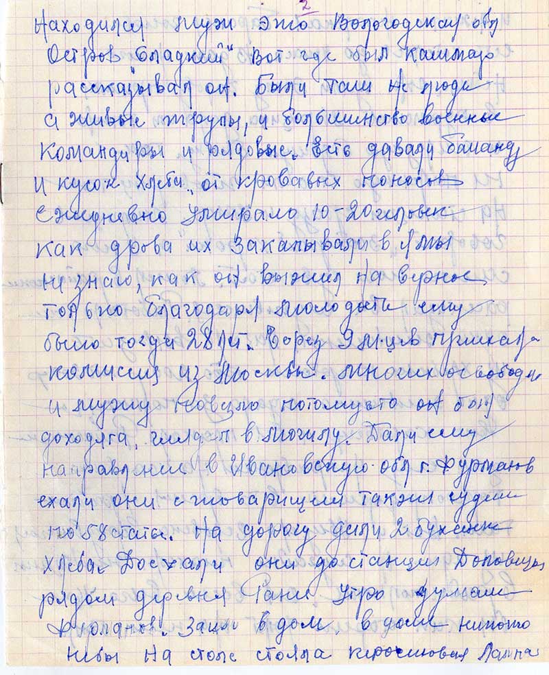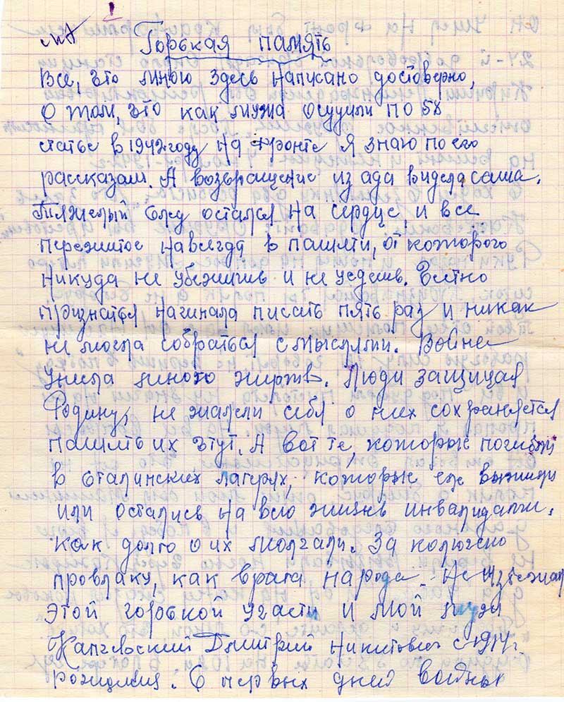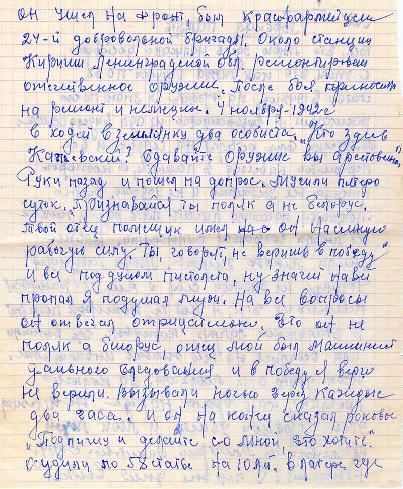 Все, что много здесь написано достоверно, о том, что как мужа осудили по 58 статье в 1942 году на фронте я знаю по его рассказам. а возвращение из ада видела сама. Тяжёлый след остался на сердце, и все пережитое навсегда в памяти, от которого никуда не убежишь и не уедешь. Честно признатся начинала писать пять раз и никак не могла собраться с мыслями. Война унесла много жертв. Люди защищая Родину, не жалели себя о них сохраняется память их чтут. А вот те, которые погибли в сталинских лагерях, которые еле выжили или остались на всю жизнь инвалидами, как долго о их молчали. За колючую провлаку, как врага народа. Не избежал этой горькой участи и мой муж Капчевский Дмитрий Никитович с 1914 г. рождения. С первых дней войны он ушёл на фронт, был красноармейцем 24-й добровольной бригады. Около станции Кириши Ленинградской обл. ремонтировал отечественное оружие. После боя приносили на ремонт и немецкое только. 4 ноября - 1942 г в ходят в землянку два особиста. Кто здесь Капчевский? Сдавайте оружие вы арестованы» Руки назад и пошёл на допрос. Мучили пятеро суток. «Признавайся ты поляк а не белорус. Твой отец помещик имел нае он наемную рабочую силу. Ты, говорят, не веришь в победу». И все под дулом пистолета, ну значит навет пропал я подумал муж. На все вопросы он отвечал отрицательно. Что он не поляк а белорус, отец мой был машинист дальнего следования и в победу я верю. Не верили. Вызывали ночью через каждые 2 часа. И он на конец сказал роковое «Подпишу и делайте со мной, что хотите». Осудили по 58 статье на 10 лет. в лагере, где находился муж это Вологодская обл остров «Сладкий» Вот где был кошмар рассказывал он. Были там не люди а живые трупы, и большинство военные командиры и рядовые. Есть давали баланду и кусок хлеба, от кровавых поносов ежедневно умирало 10 - 12 человек как дрова их закалывали в ямы не знаю, как он выжил на верное только благодаря молодости ему было тогда 28 лет. Через 9 м-цев приехала комиссия из Москвы. Многих освободили и мужу повезло потому что он был доходяга, глядел в могилу. Дали ему направление в Ивановскую обл г. Фурманов ехали они с товарищем также судили по 58 статье. На дорогу дали 2 буханки хлеба. Доехали они до станции Домовцы рядом деревня Ранее утро думали Фурманов. Зашли в дом, в доме никого небы стояла керосиновая лампа и лежала непаленая баранья голова есть хотелось до ужаса. В доме никого не было, они взяли эту голову пришли в Фурманов. Уборщица дала им топор и железную большую банку. Так не паленую ее сели товарищ так на станции сразу и умер. Милиция говорит «Забирай хорони» а у него самого ноги едва стоят. Пошел в райисполком рассказал все случившееся. Работали там одни женщины, начали вырезать из хлебных карточек кто 200гр кто 300гр одна женщина отдала за полмесяца всю карточку и все плакали. Райисполком дал ему направление на Исаевское торфопредприятие в то время я работала там. Вот и увидела человека вернувшегося из ада. Не случайно плакали женщины в райисполкоме. Он весил всего 46 кг бы как старик 70 лет на нем было одно рванье брюки худые подпоясанные веревкой ботинки рваные шапка еле жива. На голове ни одного волоса. Свет не без добрых людей - Директор торфопредприятия был человек прекрасный. Он вызвал повара и попросил кормить Капчевского по лучше, выдали ему фуфайку ватные брюки директор отдал ему свою шапку заказал скатать валенки. Вот 