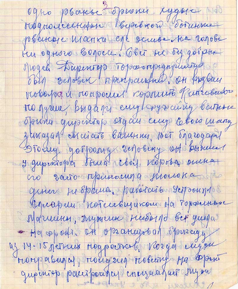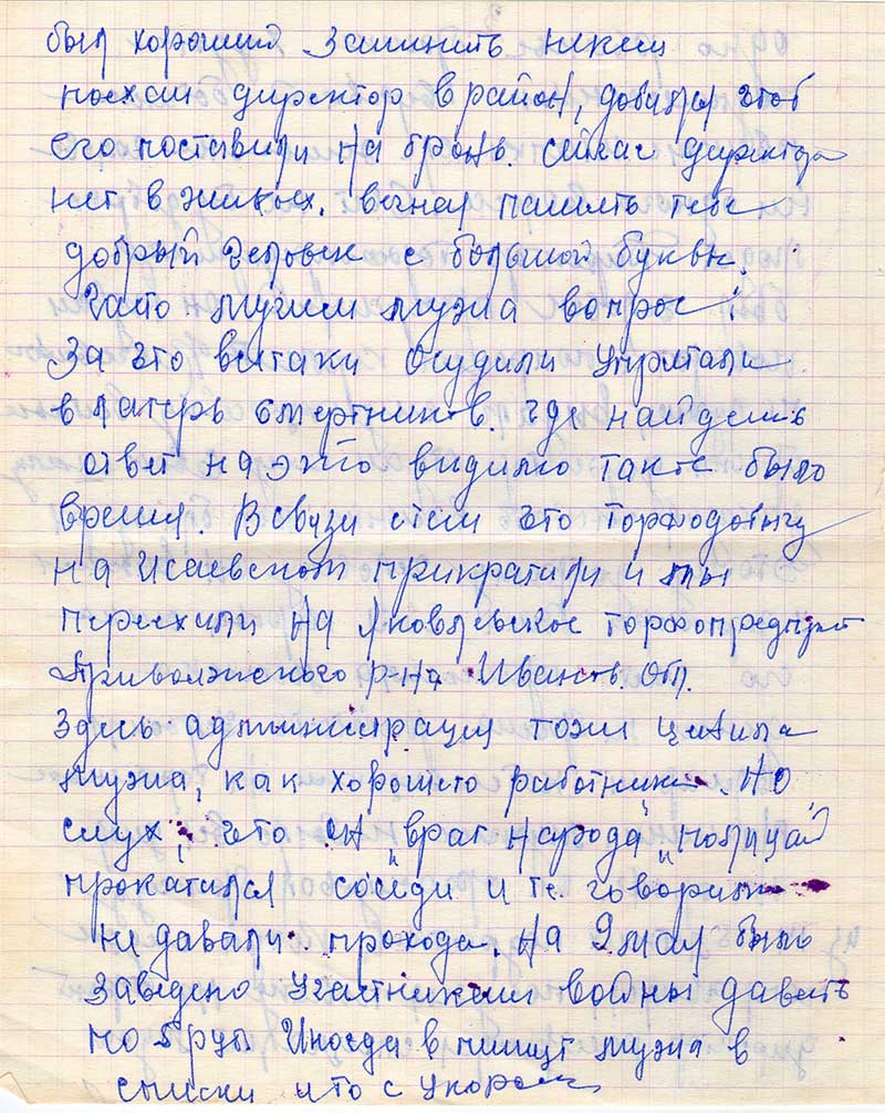 Здесь администрация тоже ценила мужа, как хорошего работника. Но слух, что он «враг народа» «полицай» прокатился соседи и те говорили не давали прохода. На 9 мая было заведено участникам войны давать по 5 руб. Иногда в пишут мужа в списки и то с укором. Я отдавала ему свои деньги и говорила вот из конторы прислали что бы его нетравмировать.