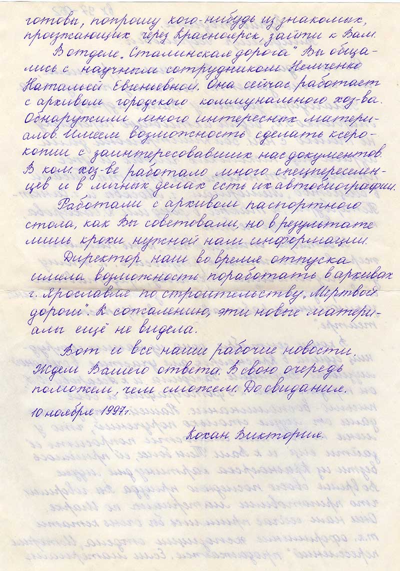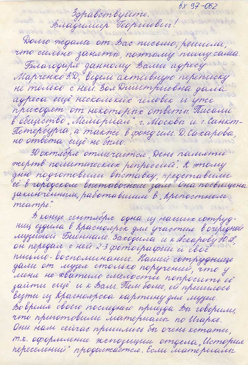 В конце сентября одна из наших сотрудниц ездила в Красноярск дл участия в очередной музейной Биеннале. Заходила и к Аскарову Ю.А., он передал с ней 2-3 фотографии и своё письмо-воспоминание. Нашей сотруднице дали от музея столько поручений, что у меня не хватило смелости попросить её зайти ещё и к Вам Тем более, ей пришлось везти из Красноярска картину для музея во время своего последнего приезда. Вы говорили, что приготовили материалы по Игарке. Они нам сейчас пришлись бы очень кстати, т.к. оформление экспозиции отдела "История переселений" продолжается. Если материалы готовы, попрошу кого-нибудь из знакомых, проезжающих через Красноярск, зайти к Вам.