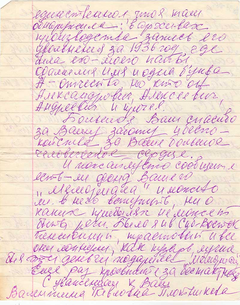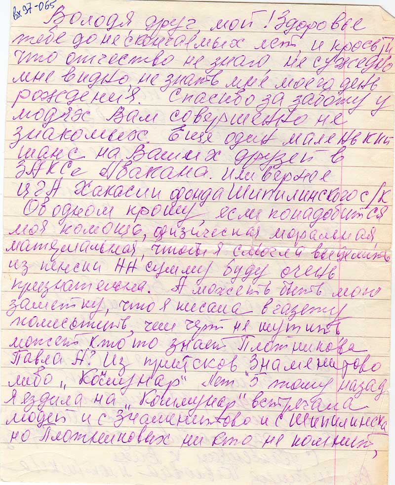 Володя, друг, мой! Здоровья тебе до нескончаемых лет, и просьти, что отчество не знаю, не суждено мне видно, не знать мне моего день рождения. Спасибо за заботу о людях Вам совершенно не знакомых. Ещё один маленький шанс на Ваших друзей в ЗАКСе Абакана. Или вернее ЦГН Хакасии фонда Шипилинского с/к. Об одном прошу, если понадобится моя помощь, физическая, моральная, материальная, чтобы я смогла выделить из пенсии НН сумму буду очень признательна. А можеть быть мою заметку, что я писала в газету поместить, чем черт не шутить, может кто то знает Плотникова Павла А? Из прийсков «Знаменитого либо «Коммунар». Лет 5 тому назад я ездила на «Коммунар» встречала людей и с «Знаменитово» и с Шипилинска но Плотниковых ни кто не помнит, единственное, что я там обнаружила: в архивах производства запись его увольнения за 1936 год, где была его - моего папы, фамилия имя и одна буква А - отчество, но кто он Александрович, Алексеевич, Андреевич и прочее.