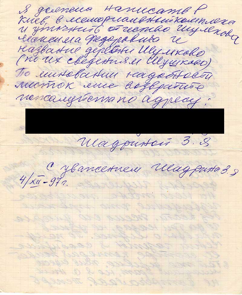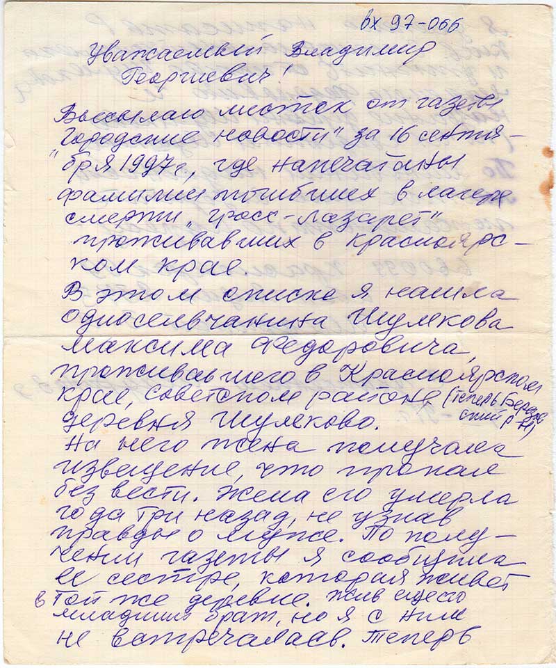 В этом списке я нашла односельчанина Шумкова Максима Федоровича, проживавшего в Красноярском крае, Советском районе (теперь Ьерёзовский р-н) в деревне Шумково. На него жена получала извещение, что пропал без вести. Жена его умерда года три назад, не узнав правды о муже. По получении газеты сообщила её сестре, которая живёт в той деревне. Жив ещё его младший брат, но я с ним не встречалась Теперь я должна написать в Киев, в мемориальный комплекс и уточнить отчество Шумкова Максима Фёдоровича и название деревни Шумково (по их сведениям, Шушково).