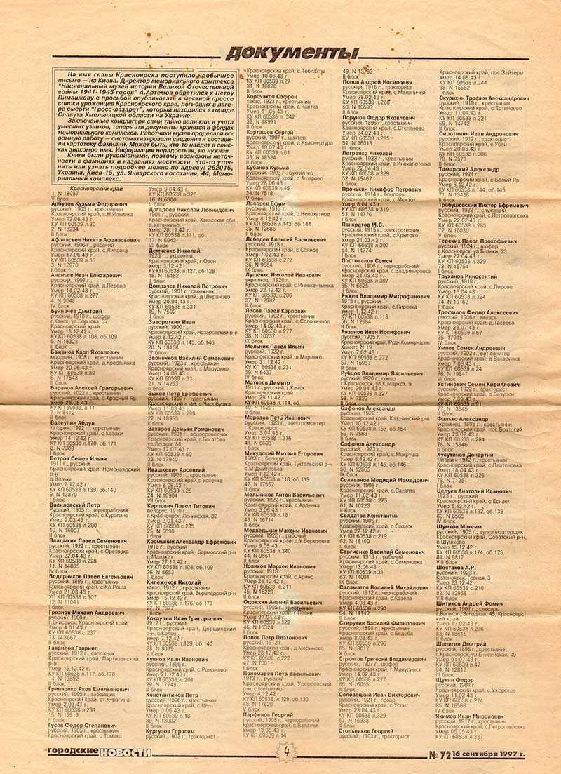 Высылаю листок от газеты "Городские новости" за 16 сентября 1997 г., где напечатаны фамилии погибших в лагере смерти Гросс-Мазарет", проживавших в Красноярском крае.