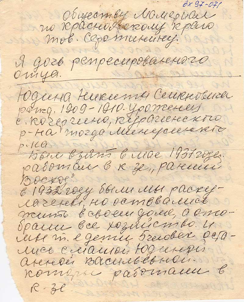 в 1932 году были мы раскулачены, но остовались жить в своем доме, а отобрали все хозяйство. И мы т.е дети, 5 человек, остались с мамой Юдиной Анной Васильевной, которы работали в к-зе.