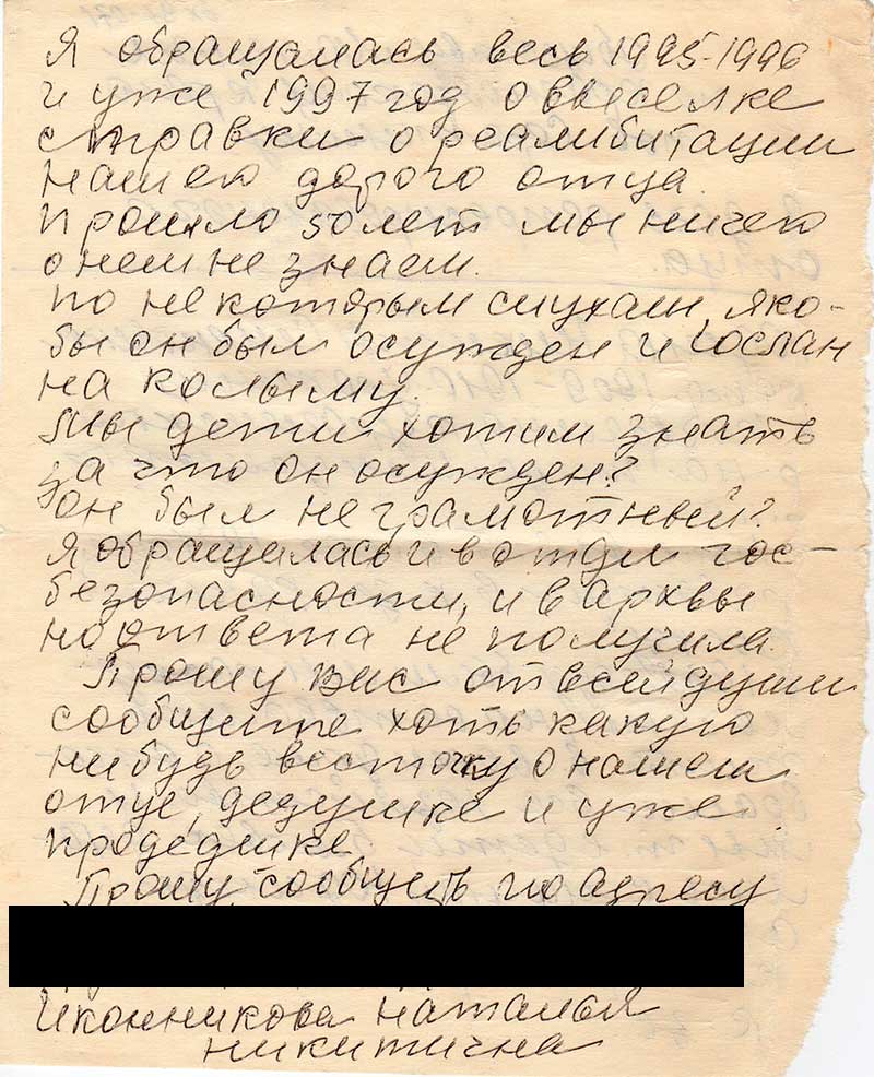 Я обращалась весь 1995-1996 и уже 1997 год о выселке справки о реабилитации нашего дорого отца. Прошло 50 лет мы ничего о нем не знаем. По некоторым слухам, якобы он был осужден и сослан на Колыму.
