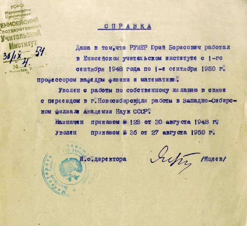 О своей жизни в Енисейске Ю. Румер пишет в автобиографической справке: «В 1948 г. я был направлен в Енисейск на поселение. Я сразу же получил место профессора в учительском институте. За два года работы в нем я опубликовал в центральной печати 10 научных работ и заметок и привлек к научной работе преподавателей института, написавших под моим руководством три работы. О моей деятельности в Енисейском учительском институте может дать сведения зам. министра просвещения Арсеньев, побывавший в Енисейске.»