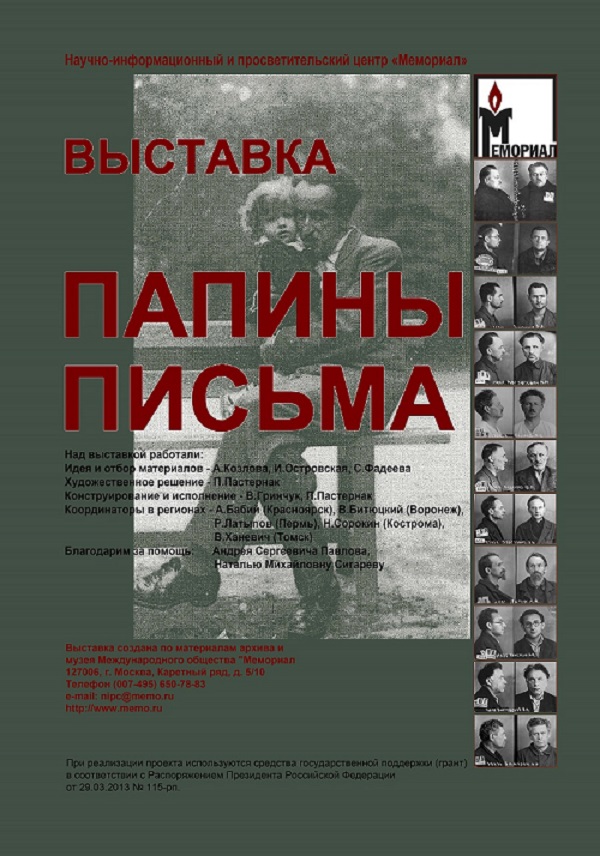 На выставке «Папины письма» представлен особый пласт свидетельств сталинской эпохи – письма заключенных своим детям. С их помощью оторванные от семьи отцы пытались поддерживать связь с детьми, воспитывать их и направлять, донося до них свою любовь и заботу. От письма к письму они ведут с сыновьями и дочерьми серьезный разговор, стремясь расширить их кругозор, заинтересовать своими увлечениями, передать собственные знания и понимание мира – их единственно возможное наследство.